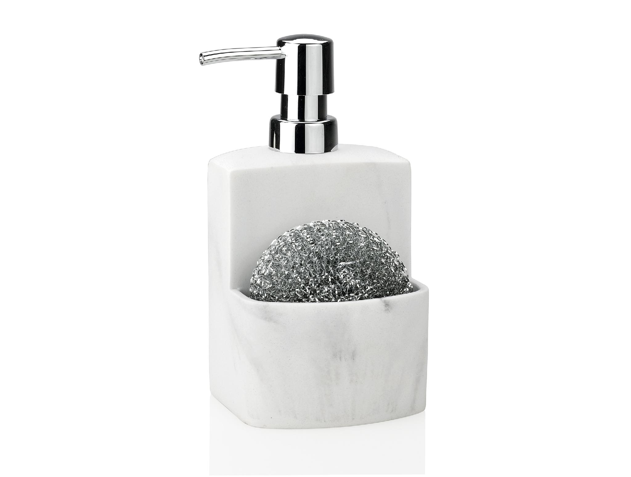 Αντλία για υγρό καθαριστικό πιάτων με εφέ λευκού μαρμάρου, σε μέγεθος compact για να μην πιάνει πολύ χώρο πάνω στον πάγκο.