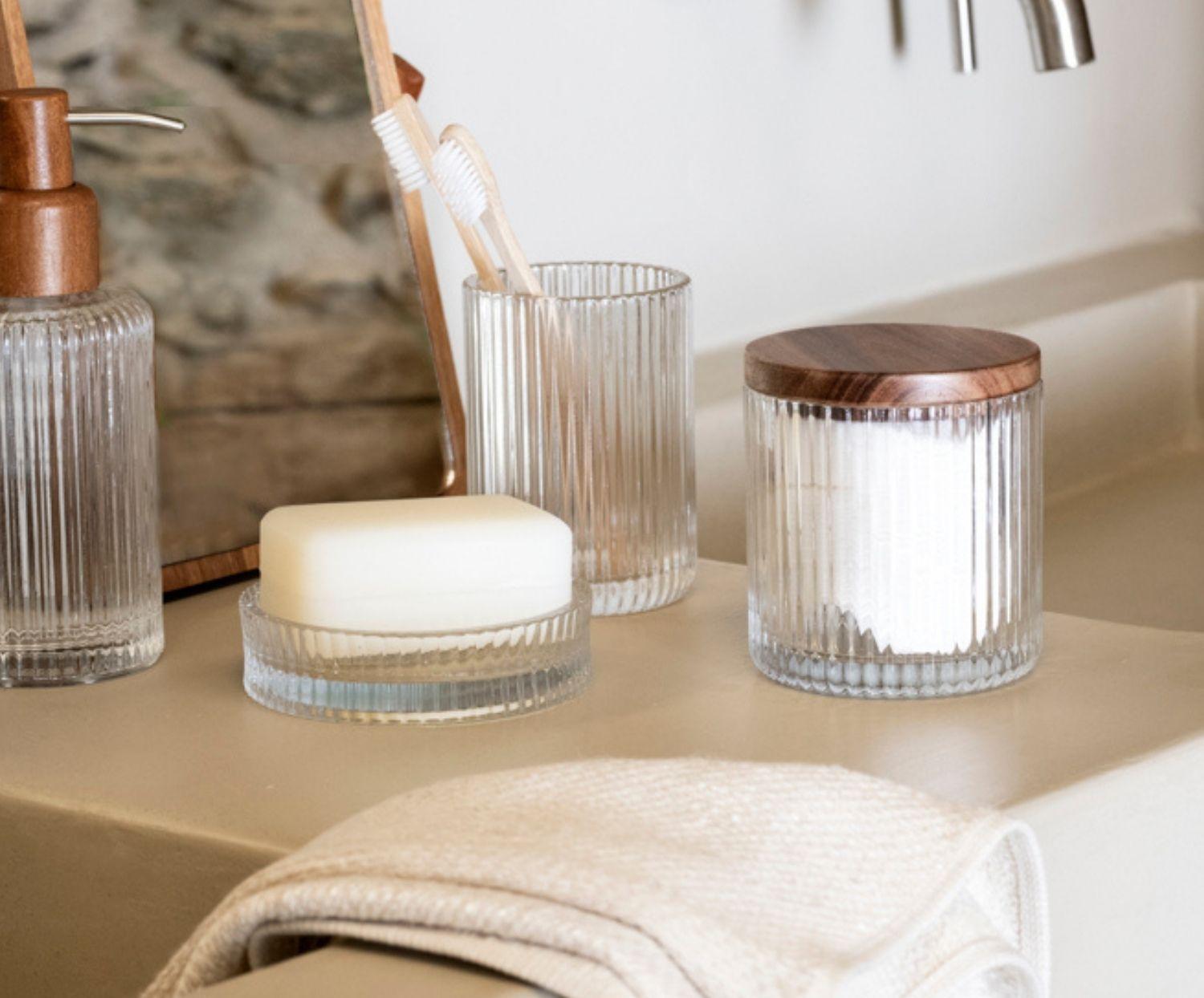 Διακοσμητικό ανάγλυφο κουτί πολλαπλών χρήσεων από διαφανές γυαλί με καπάκι. ΄Ένα κομψό κομμάτι σε vintage στυλ που μπορεί να συνδυαστεί με υπόλοιπα αξεσουάρ της συλλογής. Είναι ιδανικό για οργάνωση μπάνιου και έχει το τέλειο μέγεθος για τους δίσκους ντεμακιγιάζ.