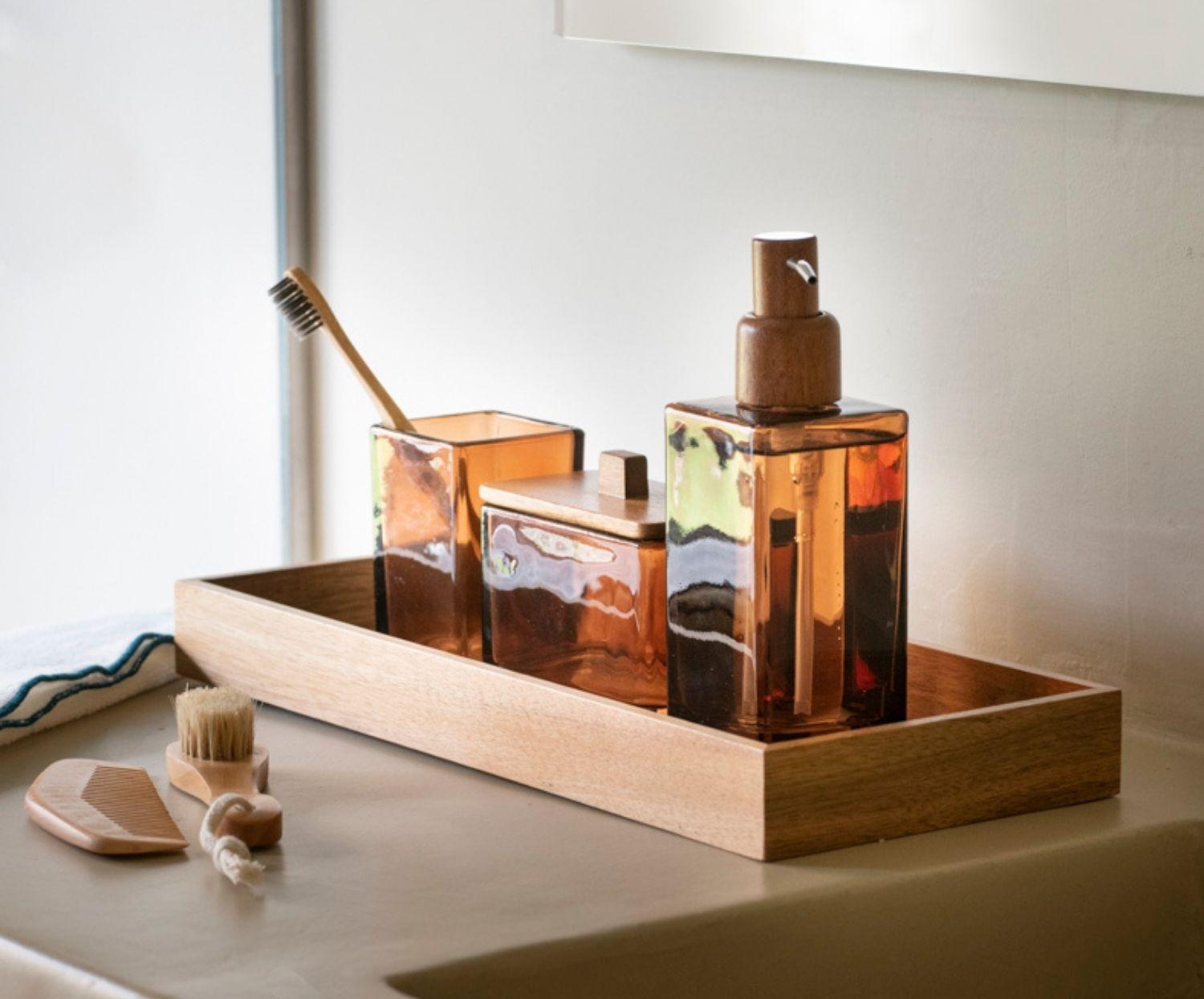 Διακοσμητικό κουτί πολλαπλών χρήσεων από καφέ γυαλί με καπάκι. ΄Ένα κομψό κομμάτι σε vintage στυλ που μπορεί να συνδυαστεί με υπόλοιπα αξεσουάρ της συλλογής. Είναι ιδανικό για οργάνωση μπάνιου και έχει το τέλειο μέγεθος για τους δίσκους ντεμακιγιάζ.