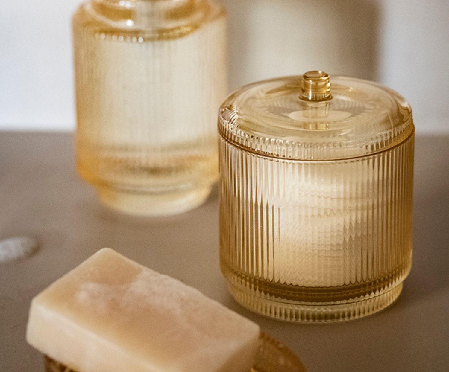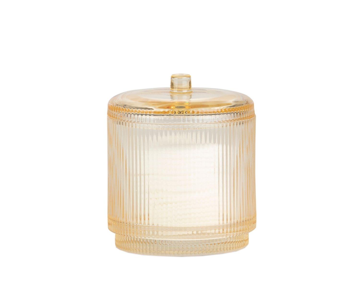 Διακοσμητικό κουτί πολλαπλών χρήσεων από διαφανές κίτρινο γυαλί και ανάγλυφο και καπάκι. ΄Ένα κομψό κομμάτι σε vintage στυλ που μπορεί να συνδυαστεί με υπόλοιπα αξεσουάρ της συλλογής. Είναι ιδανικό για οργάνωση μπάνιου και έχει το τέλειο μέγεθος για τους δίσκους ντεμακιγιάζ.