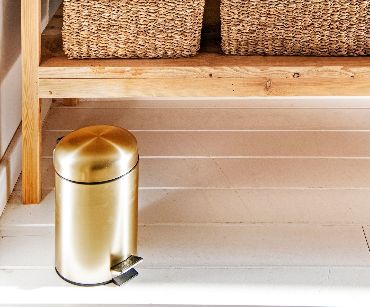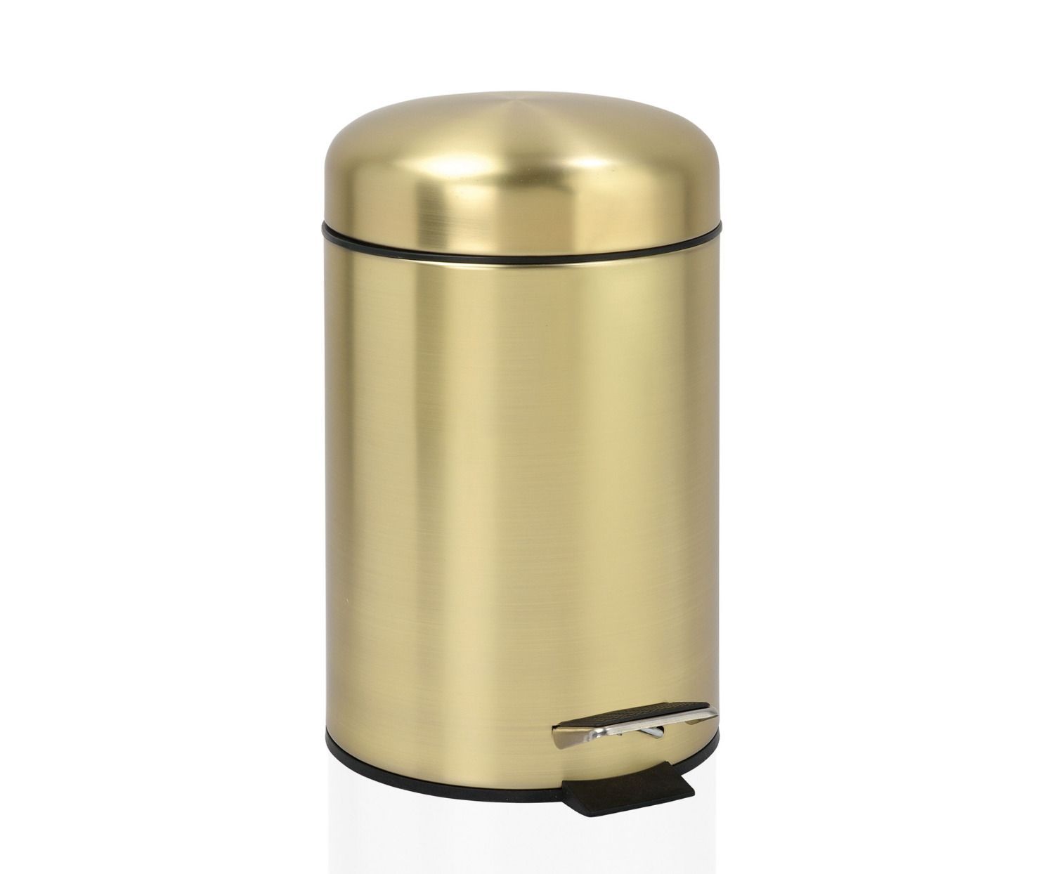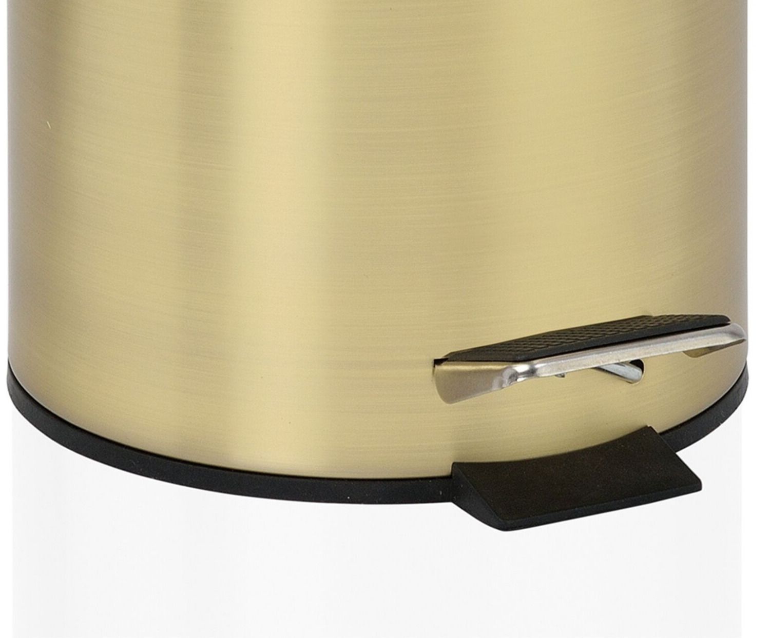 Ο χρυσός κάδος απορριμμάτων μπάνιου από ανοξείδωτο ατσάλι που είναι ανθεκτικό στην υγρασία, ματ χρυσό φινίρισμα, κυλινδρικό σχήμα και καπάκι πεντάλ που κλείνει αργά, είναι ιδανικός για μπάνια σε γήινα χρώματα και πολυτελές στυλ.