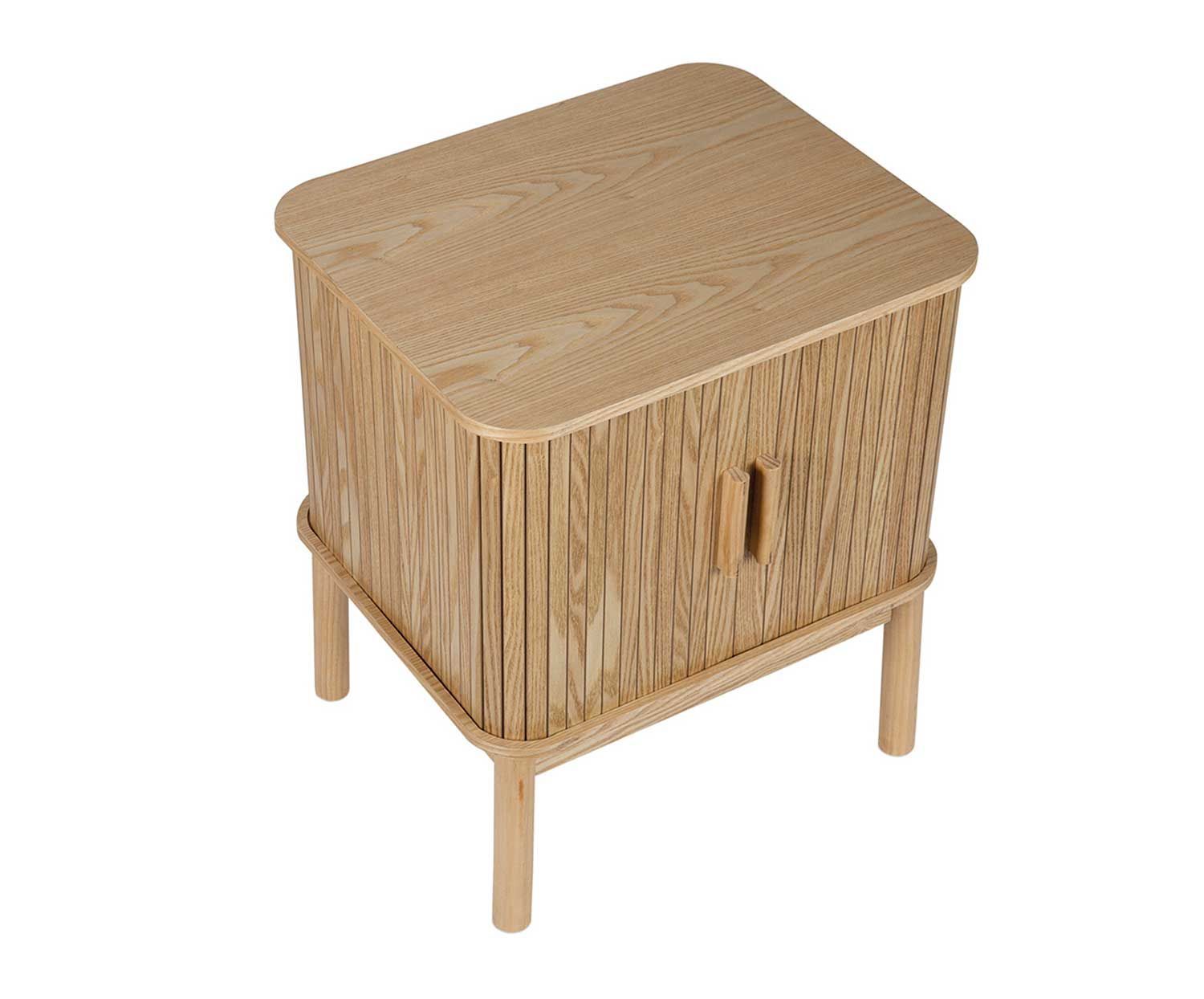 Αυτό το κομοδίνο σκανδιναβικού στυλ συνδυάζει σταχτόξυλο με ξύλο πεύκου για τα πόδια και η πρωτοτυπία του βρίσκεται στο ντουλαπάκι του, που ανοίγει με κλείσιμο τύπου κουρτίνας ενσωματώνοντας δύο λαβές για μεγαλύτερη άνεση.