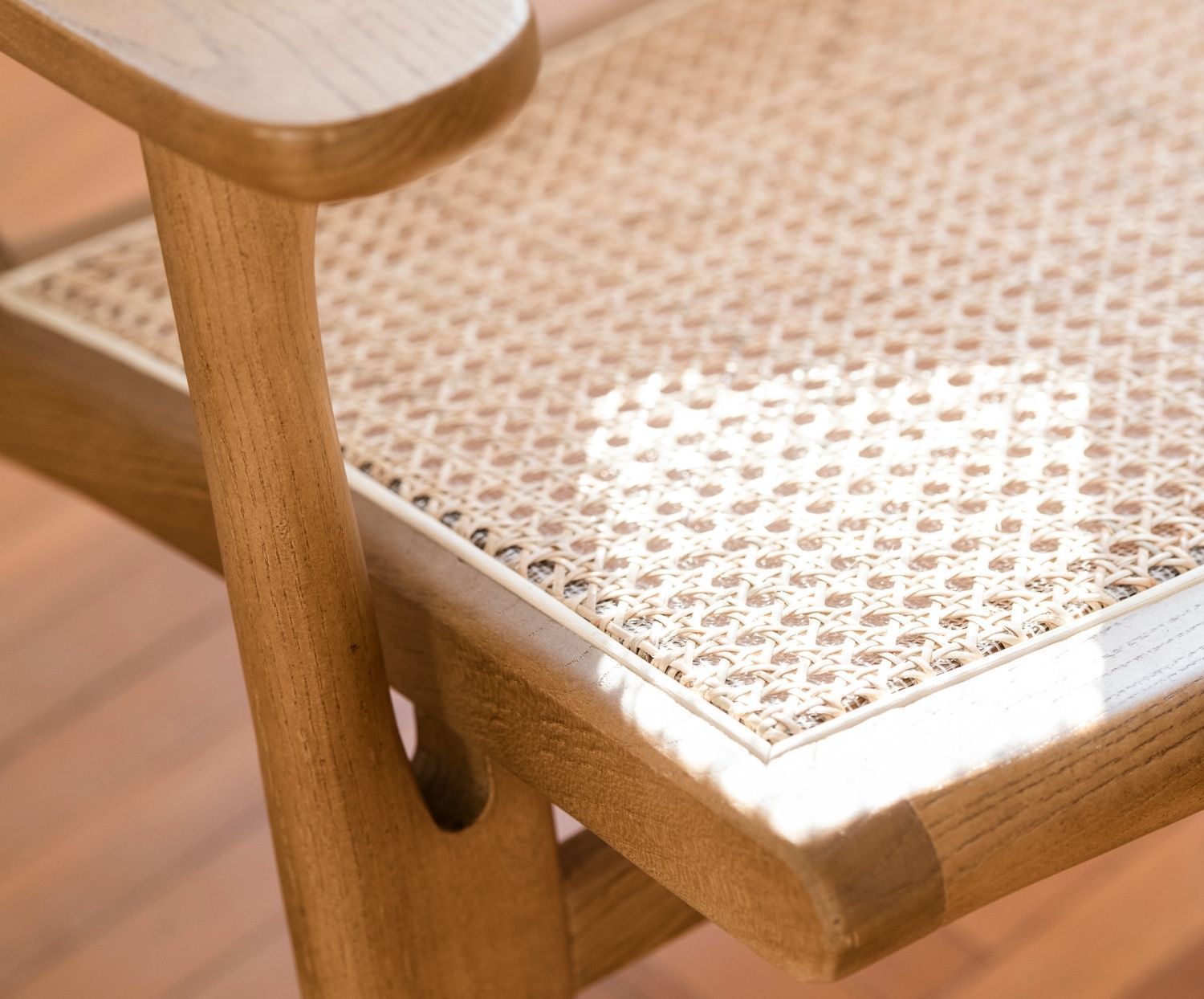 Η πολυθρόνα Emily αναμιγνύει τη ζεστασιά του ξύλου φτελιάς με το μπαστούνι, μια πολύ εύκαμπτη και ανθεκτική φυσική ίνα.