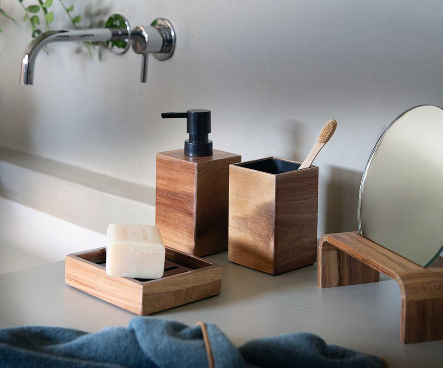 Ποτηράκι φια οδοντόβουρτσες από φυσικό ξύλο ακακίας, αποτελεί μέρος ενός πλήρους σετ που αποτελείται από dispenser, βάση για σαπούνι και πιγκάλ.