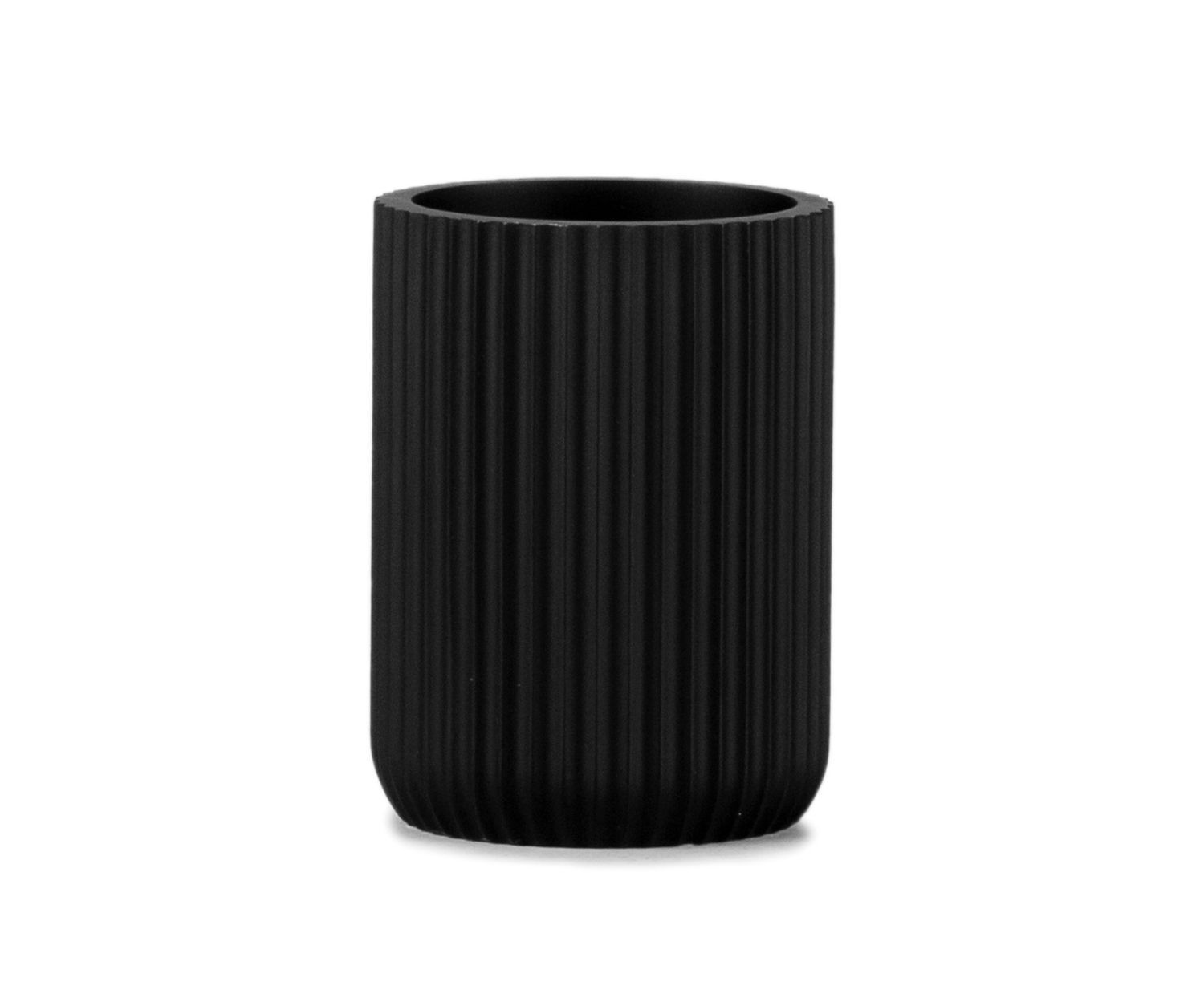 Το ποτηράκι για τις οδοντόβουρτσες είναι κατασκευασμένο από μαύρη πολυρητίνη, έχει κυλινδρικό σχήμα και ραβδωτή ανάγλυφη υφή.