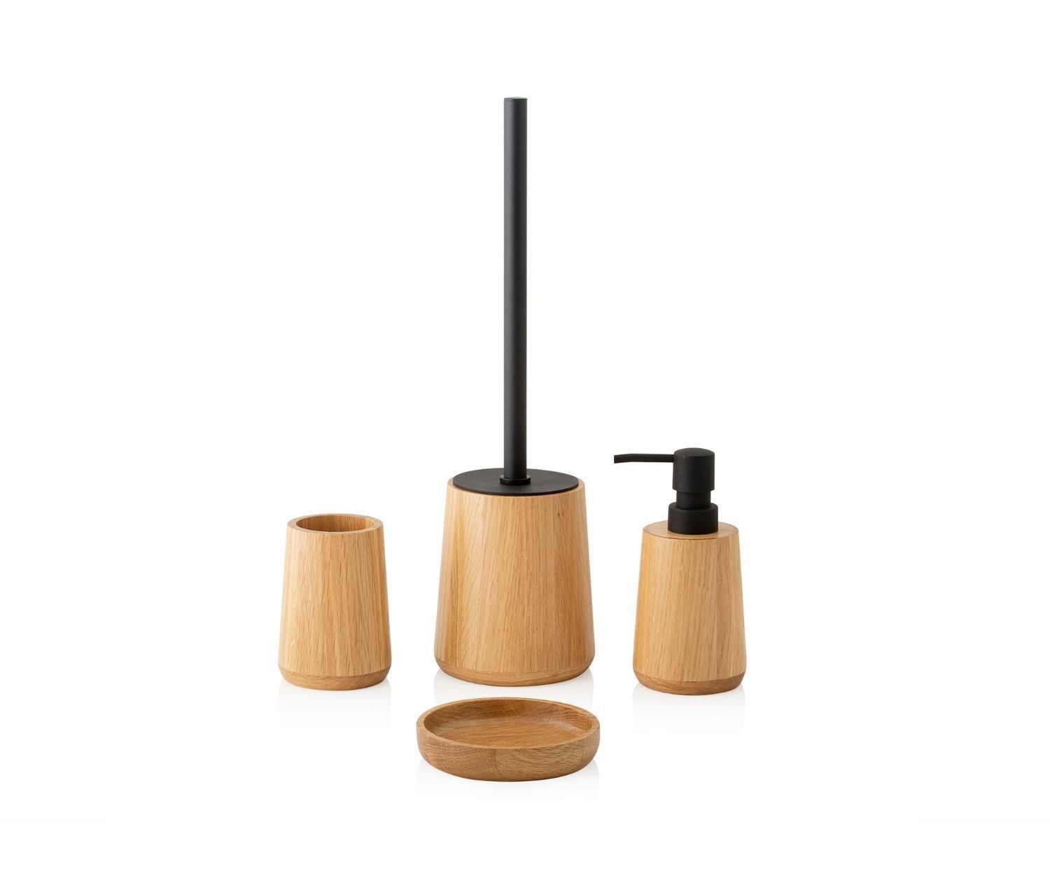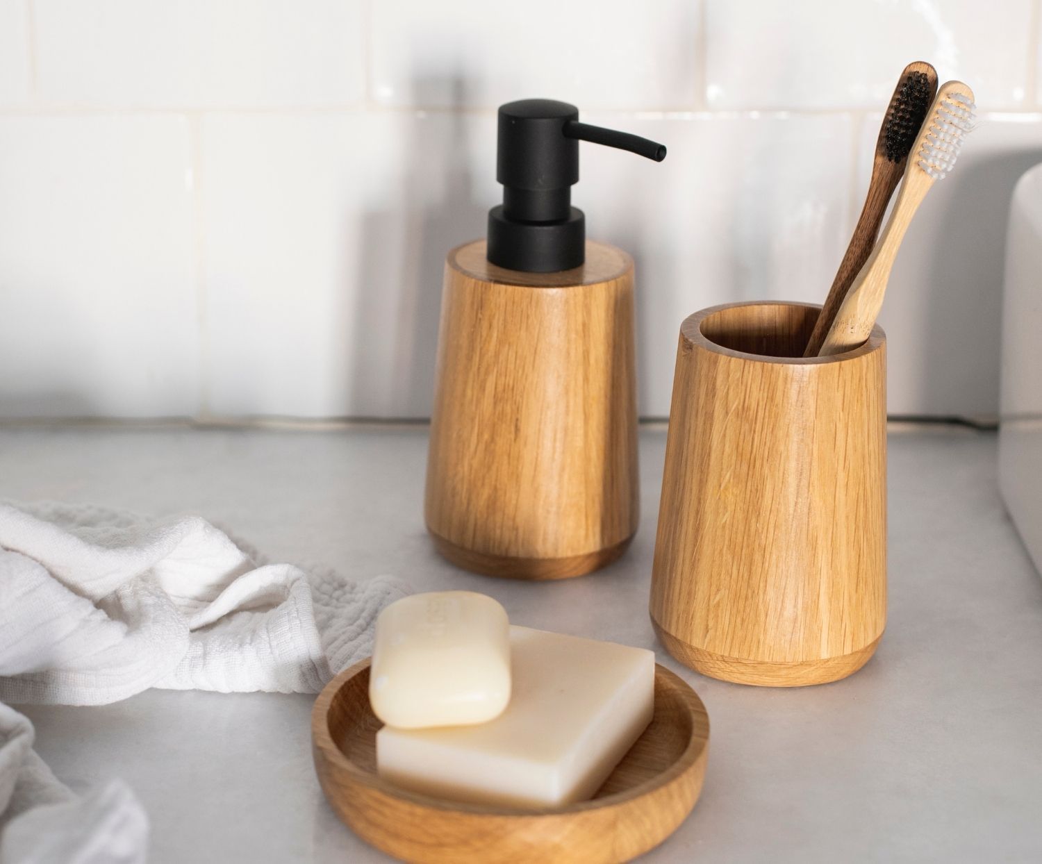 H στρογγυλό ποτηράκι για οδοντόβουρτσες από ξύλο δρυός με τα χαρακτηριστικά νερά του ξύλου να διακρινονται, θα δώσει φυσική αίσθηση στο μπάνιο σας.