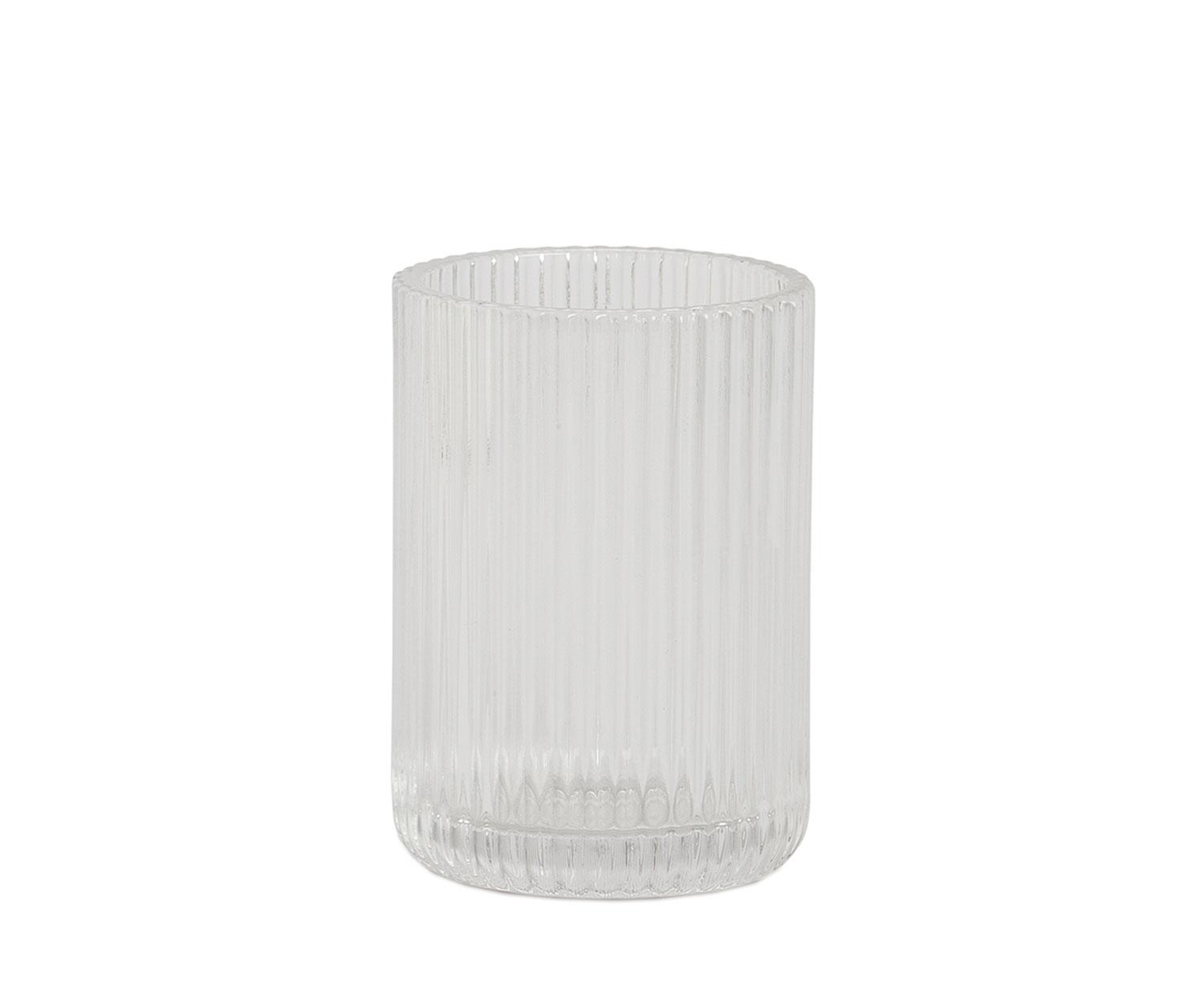 Ποτηράκι για οδοντόβουρτσες από γυαλί με ανάγλυφες ρίγες και στρογγυλό σχήμα. Αποτελεί μέρος ενός σετ που αποτελείται επίσης από αντλία για σαπούνι, ποτηράκι για οδοντόβουρτσες και γυάλινο βάζο με καπάκι..