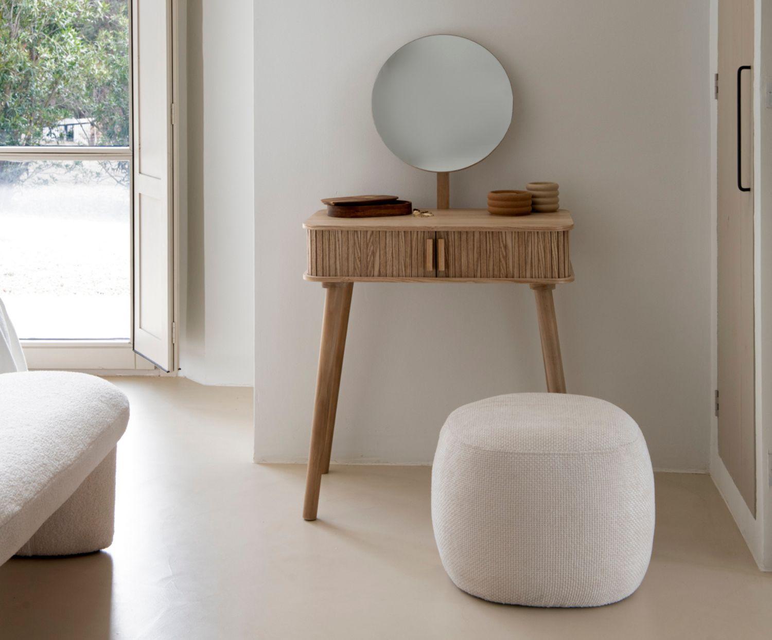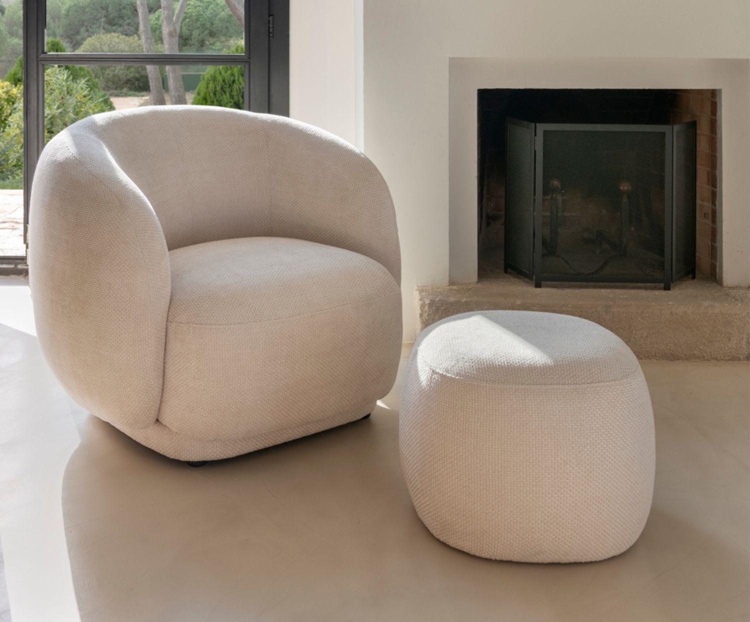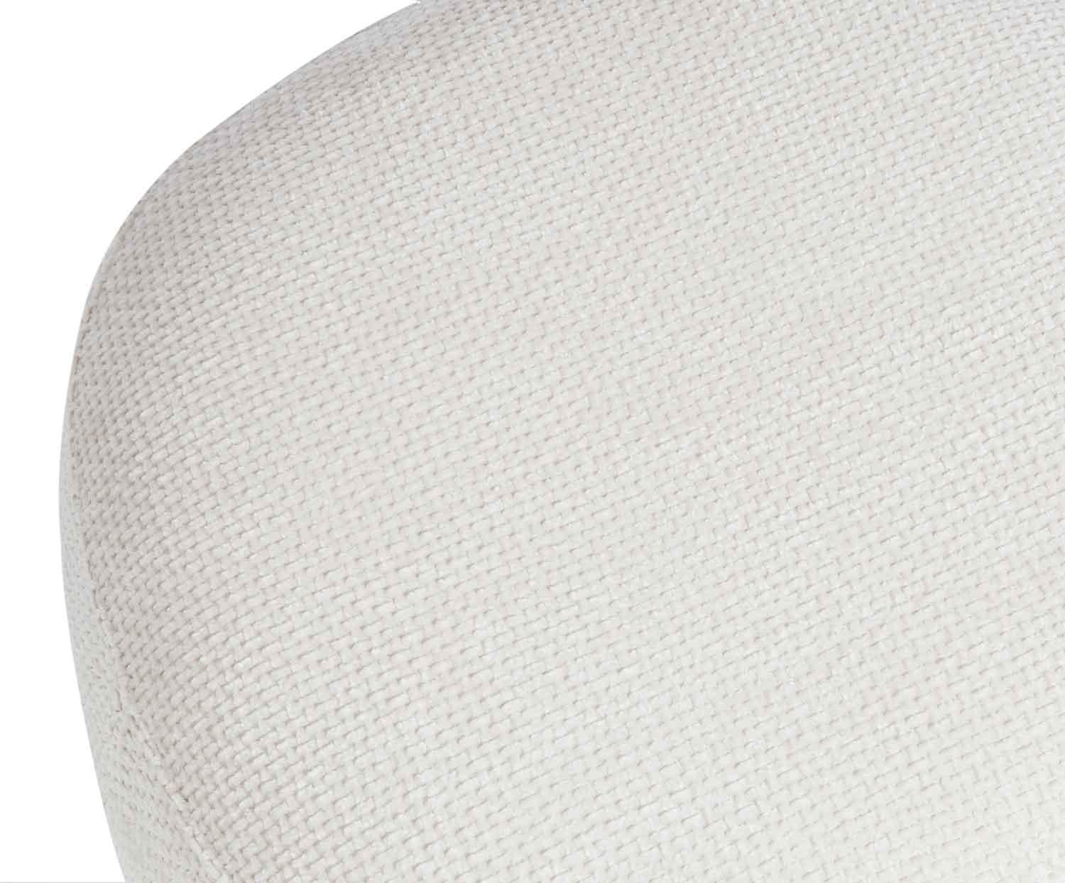 Το πουφ σε μοντέρνο στυλ επενδυμένο με λευκό ύφασμα και σκελετό από μασίφ ξύλο θα σας προσφέρει ένα άνετο κάθισμα και ο ευέλικτος σχεδιασμός του θα γίνει ο τέλειος σύντροφος για τη πολυθρόνα ή τον καναπέ, χρησιμεύοντας ως βοηθητικό και λειτουργικό έπιπλο.