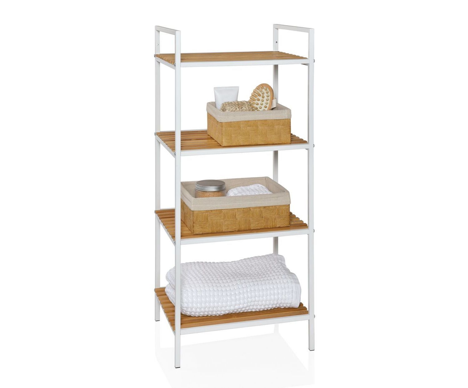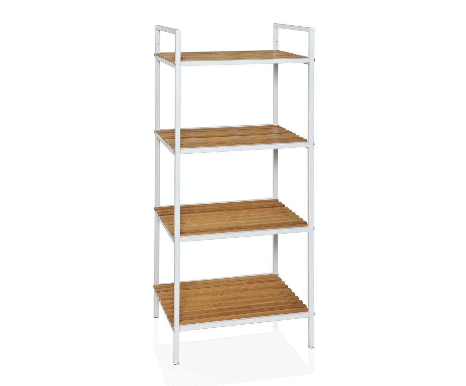 Η ραφιέρα μπάνιου από λευκό μέταλλο και μπαμπού έχει 4 ξύλινα ράφια και ο τετράγωνος σκελετός το καθιστά τέλεια επιλογή για να χωρέσει σε οποιαδήποτε γωνία.