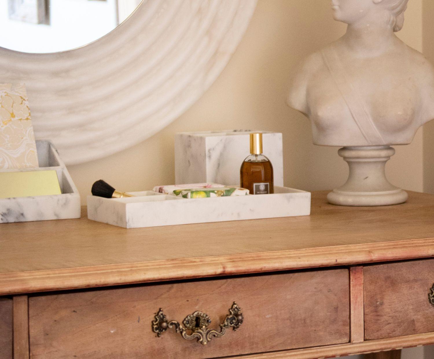 Βάση οργάνωσης με εφέ λευκού μάρμαρου, κατάλληλη να τοποθετηθεί στο μπάνιο, την κουζίνα ή το γραφείο σας.