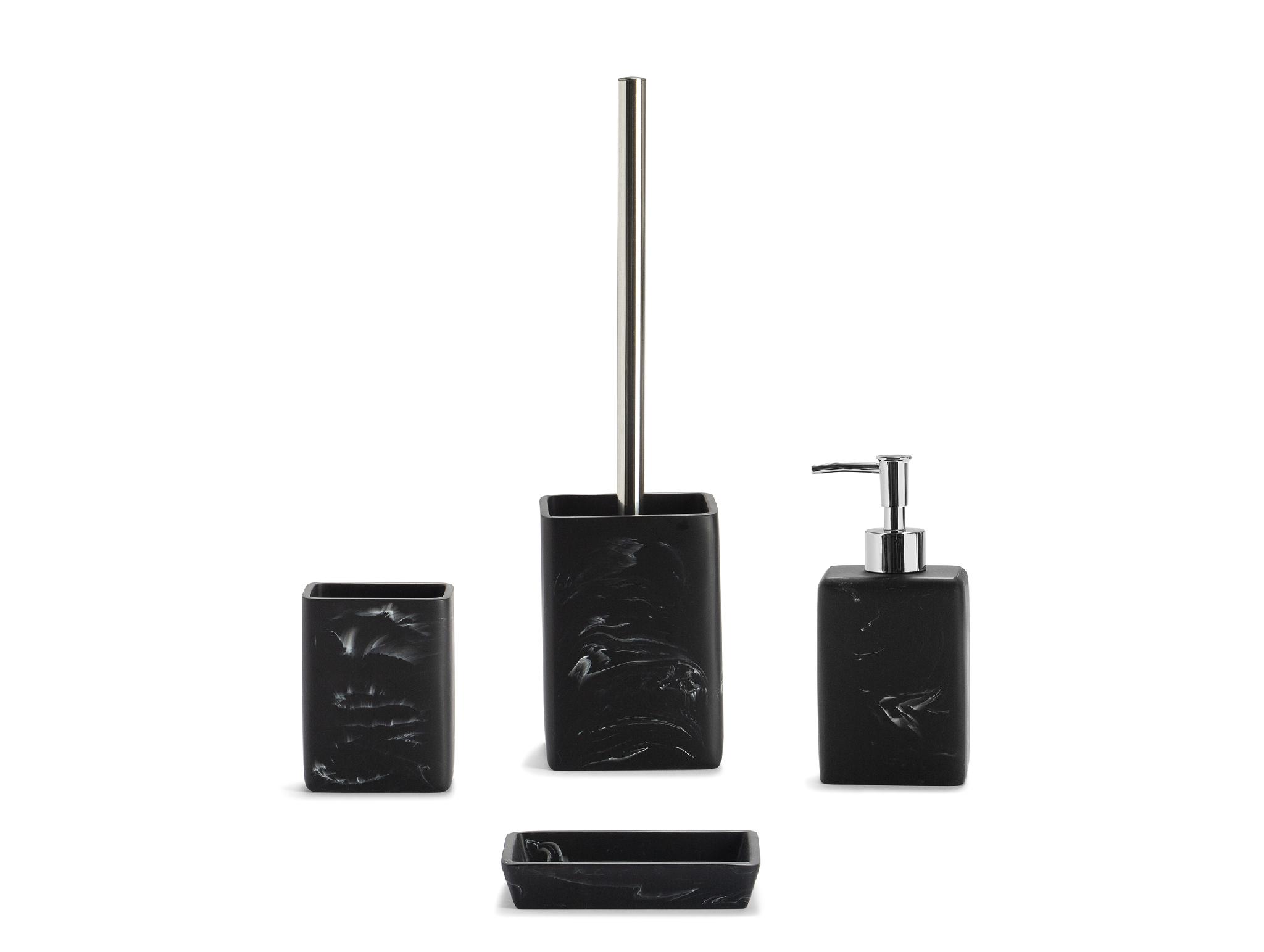 Βάση για σαπούνι με εφέ μαύρου μαρμάρου απο πολυρεζίνη σε ορθογώνιο σχήμα. Αποτελεί μέρος ενός σετ που αποτελείται επίσης από αντλία για σαπούνι, ποτηράκι για οδοντόβουρτσες και πιγκάλ μπάνιου.