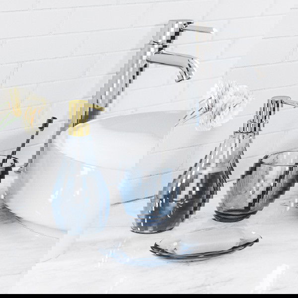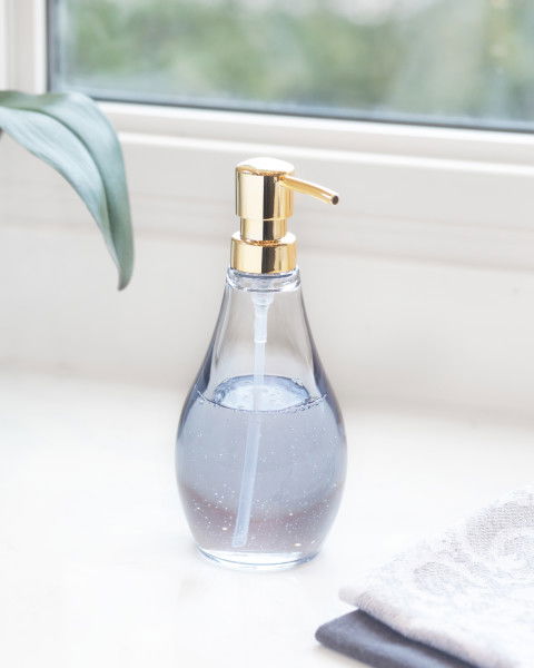 Μπλε διαφανής αντλία για υγρό σαπούνι, μέρος της υπόλοιπης σειράς Droplet. Με κομψό σχεδιασμό και διακριτικό στυλ αυτό το ντισπένσερ θα ταιριάξει εύκολα σε κάθε μπάνιο δίνοντας μια απαλή μινιμαλ νότα.