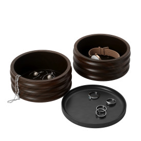 Αυτή η κοσμηματοθήκη είναι η τέλεια προσθήκη για να σας βοηθήσει να αποθηκεύσετε και να οργανώσετε τη συλλογή αξεσουάρ σας. Το επιμεταλλωμένο μεταλλικό καπάκι του Tesora λειτουργεί ως δίσκος για αποθήκευση και εμφάνιση εύκολα προσβάσιμων αξεσουάρ. Ο σχεδιασμός των δύο επιπέδων του το καθιστά μια ευέλικτη λύση αποθήκευσης που μπορεί να στοιβάζεται το ένα πάνω στο άλλο για εξοικονόμηση χώρου ή να διατηρείται χωριστά. Το τέλειο μέγεθός του το καθιστά εύκολο να το τοποθετήσετε δίπλα στο κομοδίνο σας για εύκολη πρόσβαση και για να διασφαλίσετε ότι τα κοσμήματά σας δεν θα χαθούν.