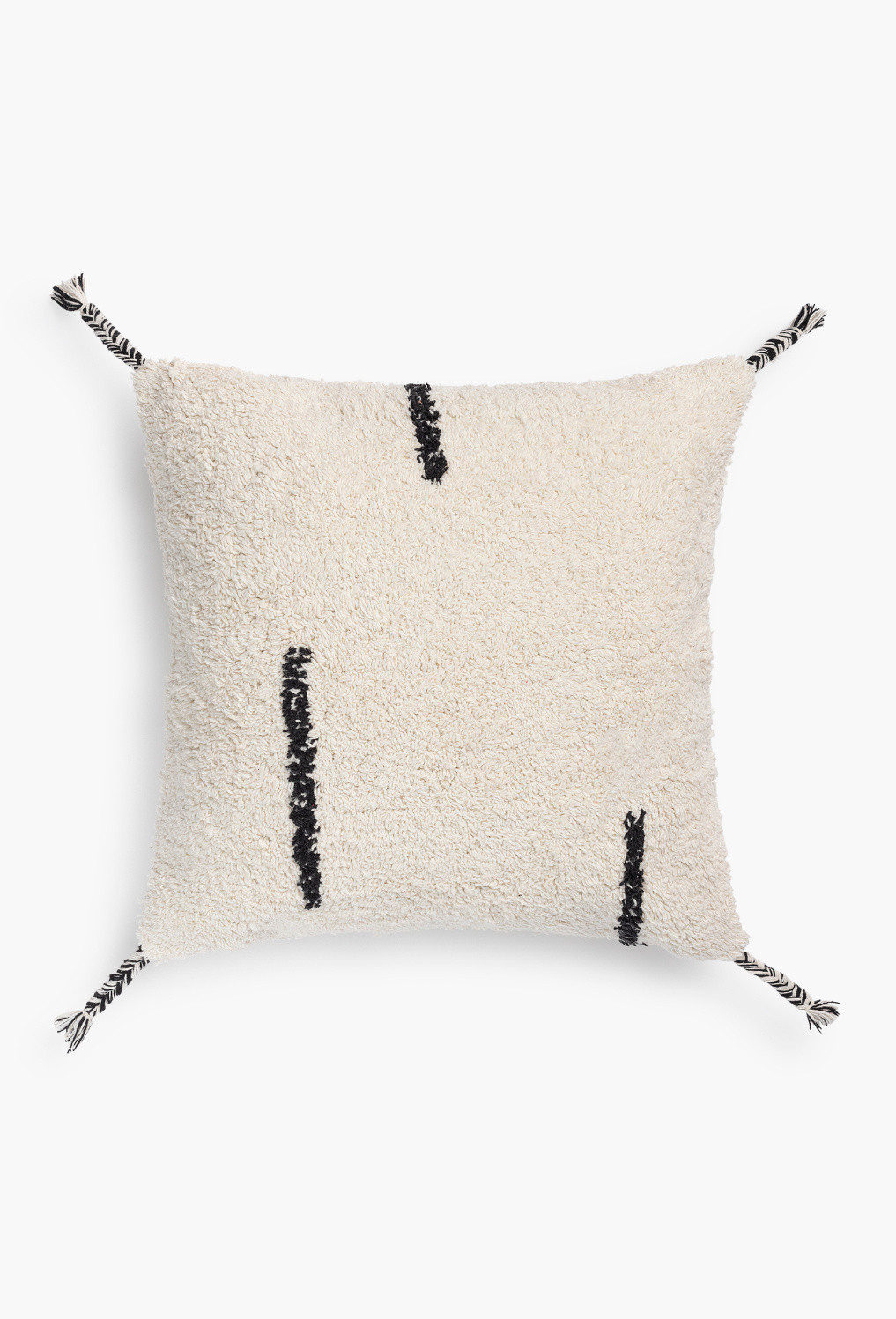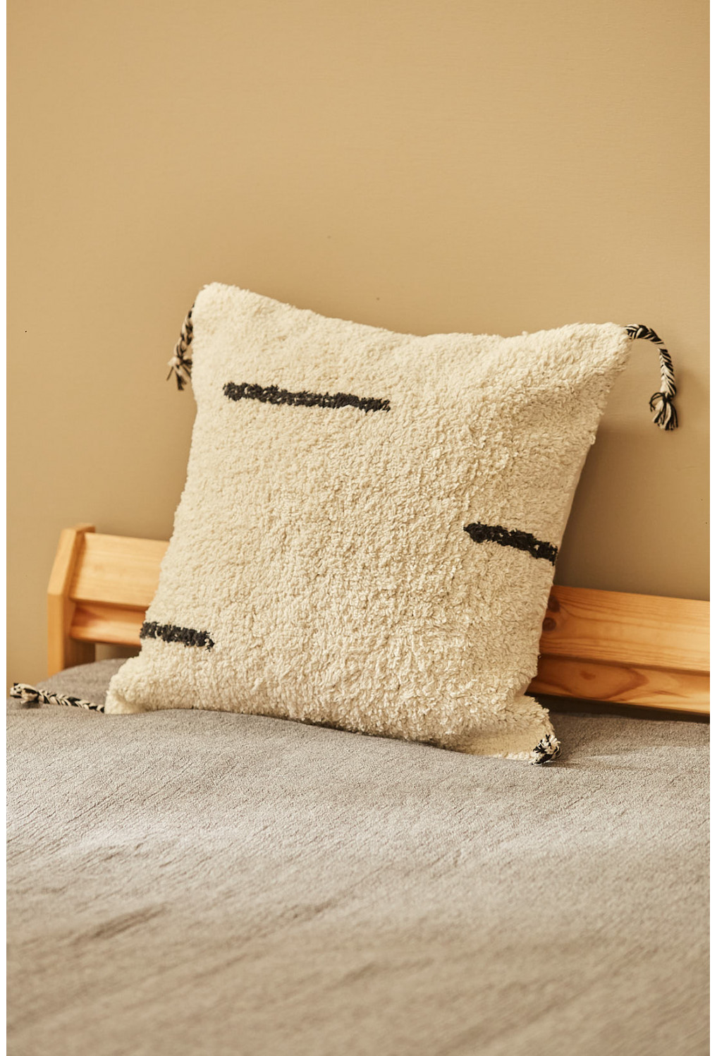 Βαμβακερή διακοσμητική μαξιλαροθήκη για με μαύρες ρίγες και κρόσσι στις 4 άκρες.