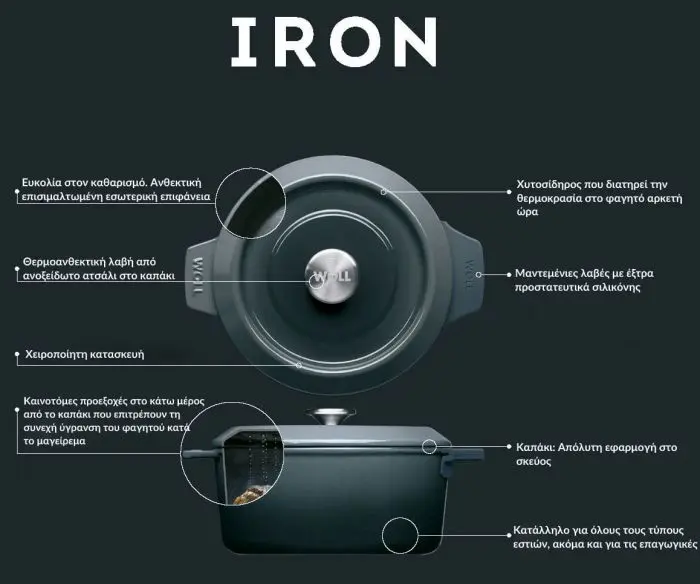 Σειρά Iron. Νέα σειρά μαντεμένιων σκευών από την Woll. Περιλαμβάνει μοναδικά σκεύη κατασκευασμένα από χειροποίητο χυτοσίδηρο (μαντέμι) με επισμάλτωση, ανθεκτικά σε πολύ υψηλές θερμοκρασίες. Τα υψηλής ποιότητας προϊόντα της Woll είναι σχεδιασμένα να ικανοποιούν ακόμα και τους πιο απαιτητικούς Chef. Όλα τα σκεύη της σειράς είναι κατάλληλα για όλες τις εστίες, ακόμα και τις επαγωγικές.