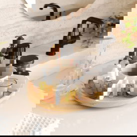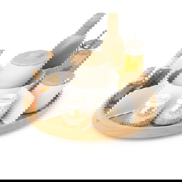 Το Bellwood Lazy Susan συνδυάζει το στυλ με την καθημερινή λειτουργία. Περιστρέφεται απρόσκοπτα 360 μοίρες, καθιστώντας εύκολη την πρόσβαση σε καθημερινά αντικείμενα μέσα σε δευτερόλεπτα. Με 5 τμήματα, υπάρχει αρκετός χώρος για την οργάνωση λαδιών, ξυδιών, μπαχαρικών, βάζας και μικρότερων κουτιών. Και δεδομένου ότι κάθε τμήμα έχει αφαιρούμενο διαχωριστικό, μπορείτε εύκολα να κρατήσετε τα πάντα στη θέση τους βοηθώντας παράλληλα στην αποφυγή ακαταστασίας. Κατασκευασμένο από ανακυκλωμένο πλαστικό και βιώσιμο ξύλο, αυτό το ευέλικτο, περιστρεφόμενο organizer μπορεί επίσης να χρησιμοποιηθεί για προϊόντα καθαρισμού, προϊόντα ομορφιάς και άλλα καθημερινά είδη. Συνδυάστε το με άλλα αντικείμενα από τη συλλογή μας Bellwood Pantry για μια συνεκτική εμφάνιση. Διαστάσεις 12″ (30 εκ.) Π x 12» (30 εκ.) Μ x 3» (7,6 εκ.) Υ.