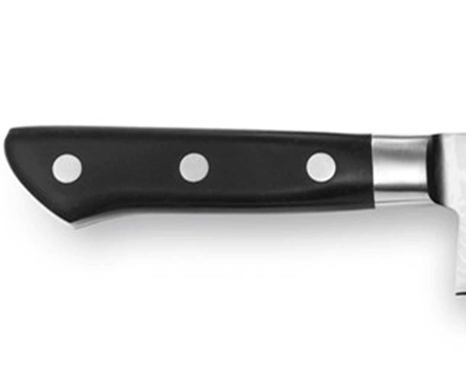 Το πρώτο μερος του μαχαιριού με το οποίο έρχεστε σε επαφή είναι η λαβή του. Η λαβή του Tojiro-Pro DP Damascus Steel δίνει την αίσθηση σταθερού κρατήματος λαβής ευρωπαϊκού τύπου. Είναι κατασκευασμένη από Eco-Wood, ένα υλικό κατασκευής που αποτελεί ένα κράμμα ιδιαίτερα ανθεκτικό στη συνεχή και σκληρή χρήση. Η μοναδική αυτή λαβή κάνει τη χρήση του μαχαιριού ιδιαίτερα άνετη και προσφέρει ένα γερό, σταθερό κράτημα και απόλυτη ισορροπία.