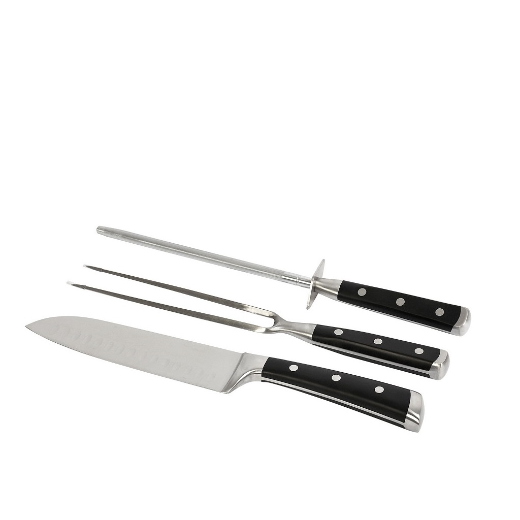 Σετ μαχαίρι shantoku, πιρούνα και ακονιστήρι, με εργονομικό σχεδιασμό. Το μαχαίρι διαθέτει λεπίδα από ανοδείξωτο ατσάλι που διασφαλίζει την τέλεια κοπή με μεγάλη ακρίβεια. Διατηρήστε τα στεγνά και καθαρά μετά από κάθε χρήση! – BBQ knife set with ergonomic design. Knife with ultra sharp, laser-contolled edge that ensures ideal cutting angle. Keep them dry and clean after use to resist rust!
