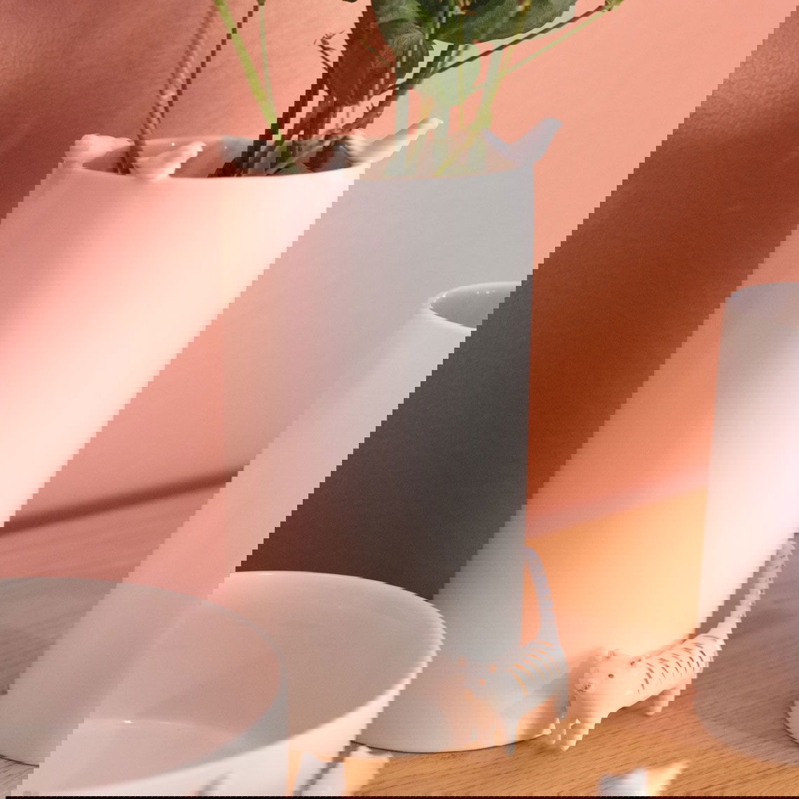 Πορσελάνινο βάζο με ανάγλυφη γάτα και πουλάκια, σε διαχρονικό σχεδιασμό ιδανικό για να διακοσμήσει το τραπεζάκι στο σαλόνι σας.