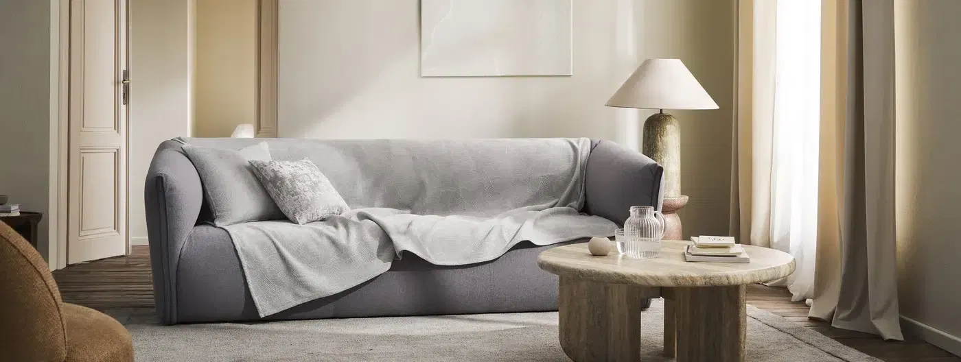 Ριχτάρι με ιδιαίτερα σταθερό ύφασμα και ανάγλυφη ύφανση. Κατασκευασμένο με επιπλέον Chenille νήμα που κάνει το ύφασμα μαλακό και αφράτο, minimal σχεδιασμός με πλούσια υφή.