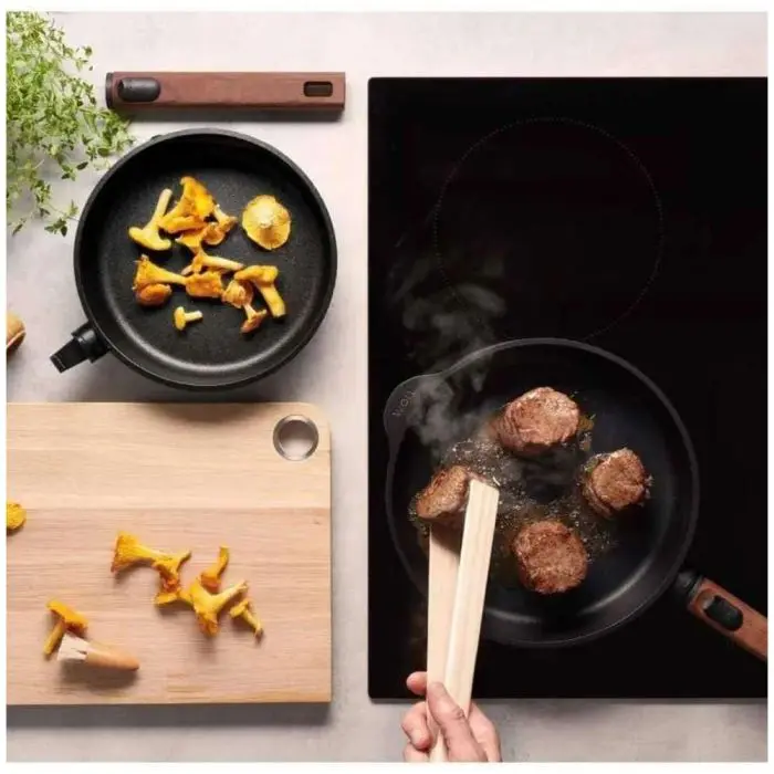 Η Woll φημίζεται για τις αποσπώμενες λαβές των σκευών της, που προσφέρουν πολλά πλεονεκτήματα στον χρήστη. Χωρίς τη λαβή, το τηγάνι χωράει αβίαστα στον φούρνο, στον νεροχύτη και στο πλυντήριο πιάτων, και είναι εύκολο να τοποθετηθεί και να στοιβαχτεί σχεδόν σε κάθε ντουλάπι.