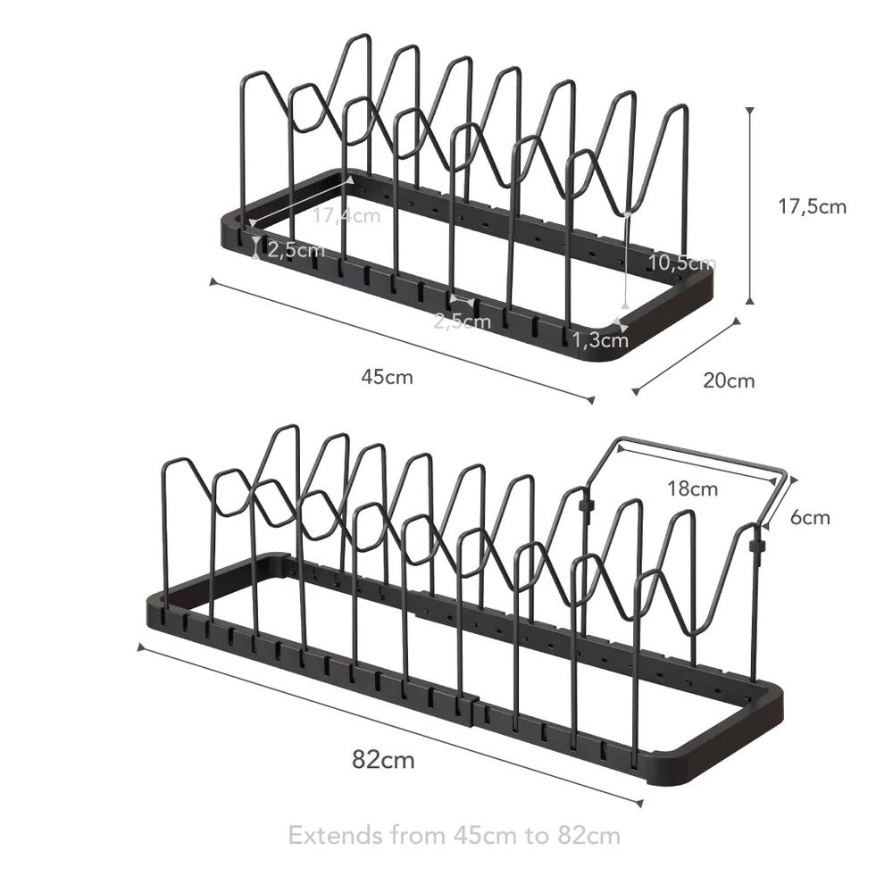 Ένας τέλειος τρόπος αποθήκευσης για τα σκεύη μαγειρέματος και τα καπάκια τους αφού μπορεί να επεκταθεί όποτε είναι απαραίτητο. Επιπλέον, μπορείτε να ρυθμίσετε τα πλαίσια στήριξης όσο κοντά ή μακριά θέλετε και περιλαμβάνεται μια επιπλέον μπάρα υποστήριξης για τη συγκράτηση των λαβών.