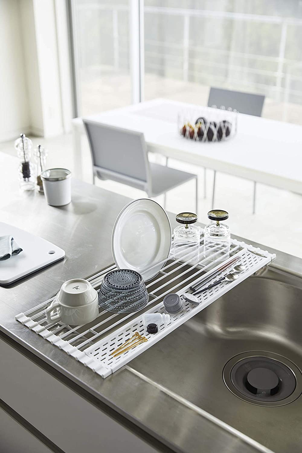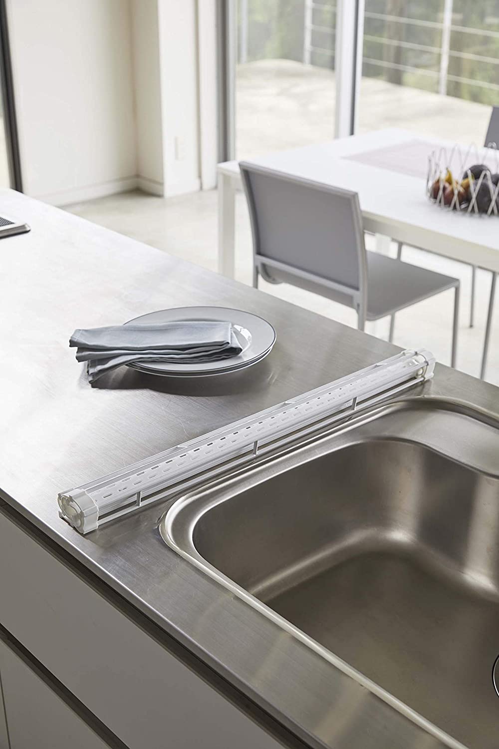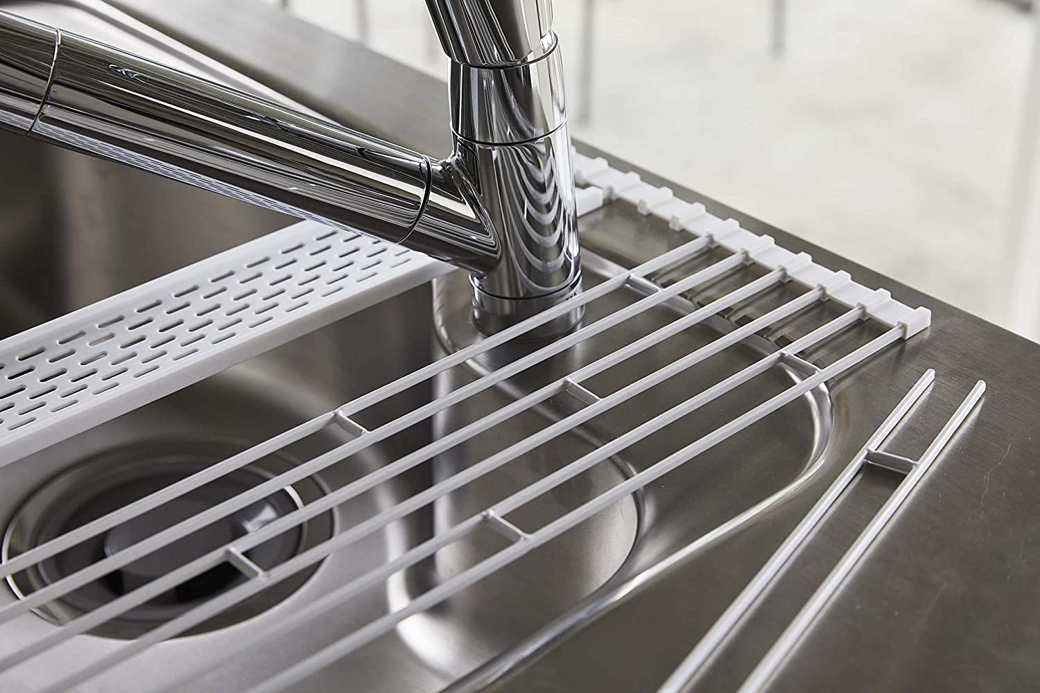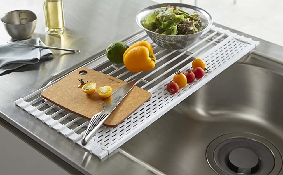 Δεν έχετε αρκετό χώρο για ένα συμβατικό στραγγιστήρι; Κανένα πρόβλημα, η πτυσσόμενη επιφάνεια στραγγίσματος είναι αυτό που χρειάζεστε! Τοποθετήστε το πάνω από το νεροχύτη και κλείστε το όταν δεν χρησιμοποιείται. Στον δίσκο σιλικόνης μπορείτε να τοποθετήσετε τα μικρότερα αντικείμενα όπως μαχαιροπήρουνα. Τα μεταλλικά μέρη μπορούν να αφαιρεθούν και να χρησιμοποιηθούν ανεξάρτητα.