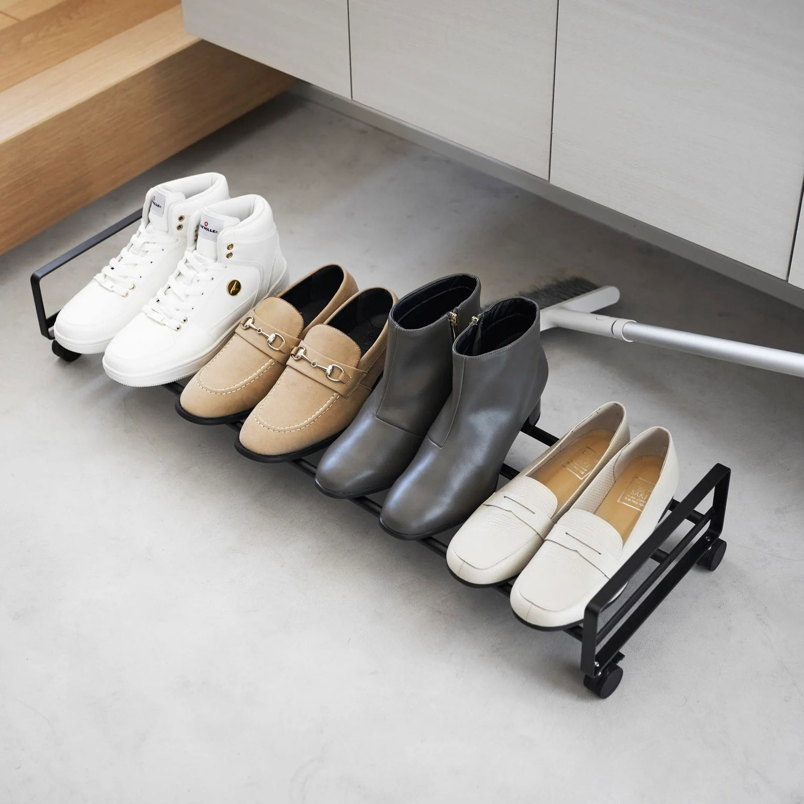 Ράφι παπουτσιών με χωρητικότητα έως και 4 ζευγάρια παπούτσια, ιδανική για τη βελτιστοποίηση του αχρησιμοποίητου χώρου της εισόδου. Ο κομψός, συμπαγής σχεδιασμός του, ταιριάζει εύκολα κάτω από τα ντουλάπια και οι ενσωματωμένοι τροχοί επιτρέπουν την εύκολη μετακίνηση του.