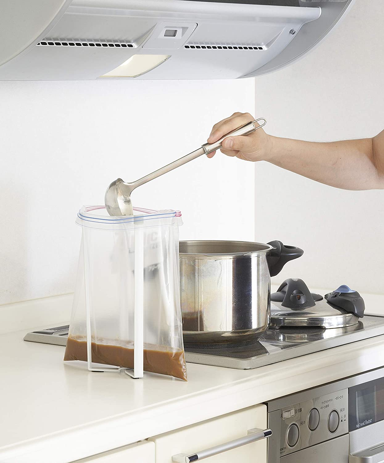 Ένα πολυλειτουργικό σταντ για την κουζίνα σας που μπορεί να χρησιμοποιηθεί για να πετάτε τα σκουπίδια την ώρα του μαγειρέματος τοποθετώντας μία σακούλα, καθώς και για να στεγνώσετε μπουκάλια ή μπιμπερό. Είναι μικρό και συμπαγές και μπορεί να διπλωθεί για εύκολη αποθήκευση.