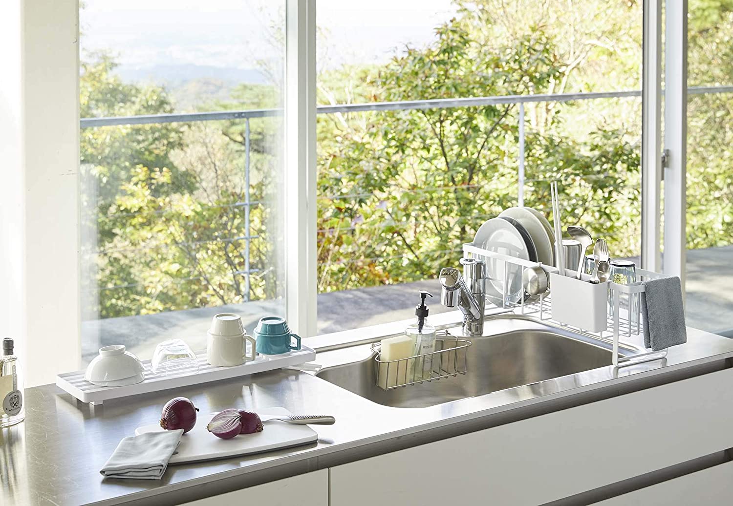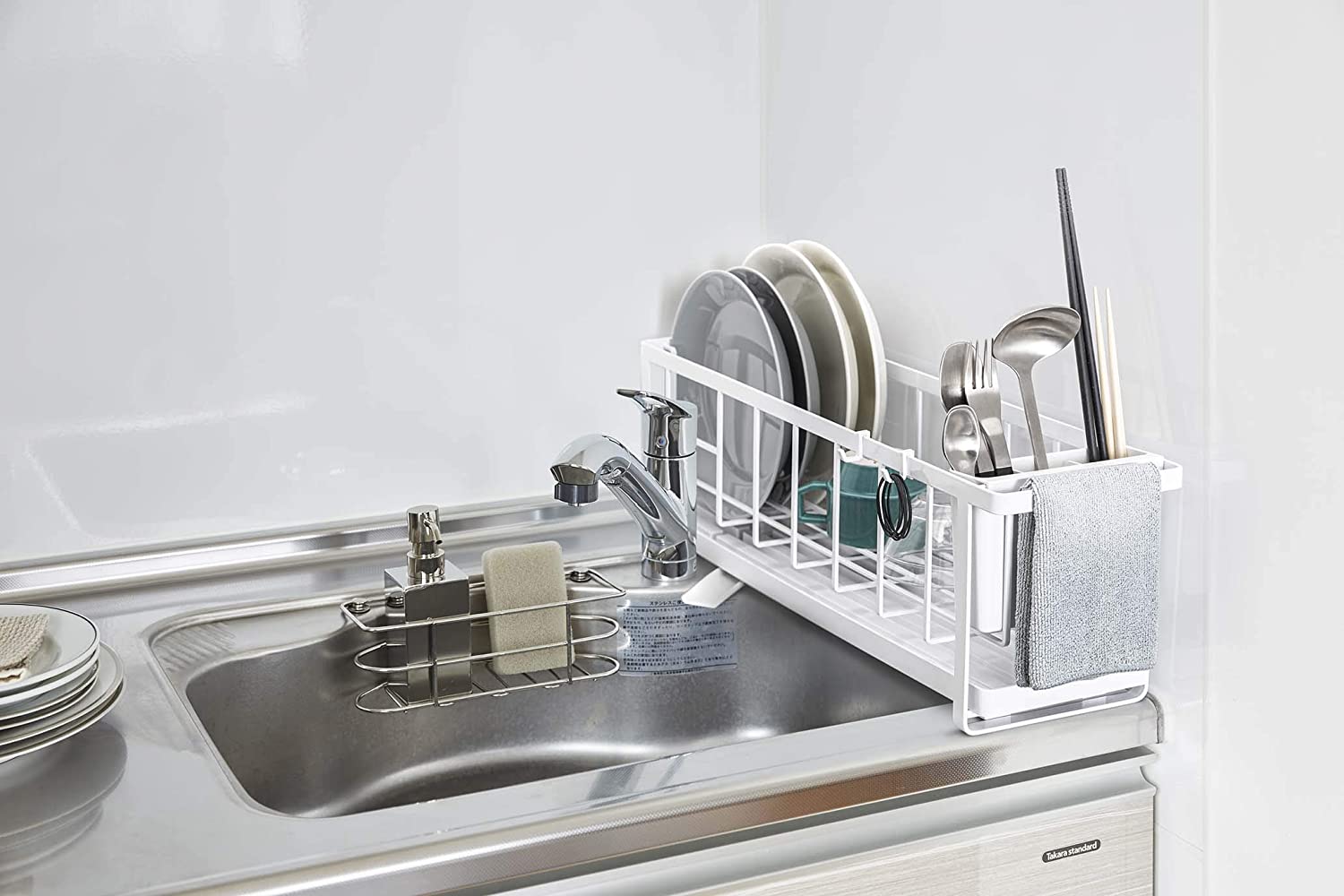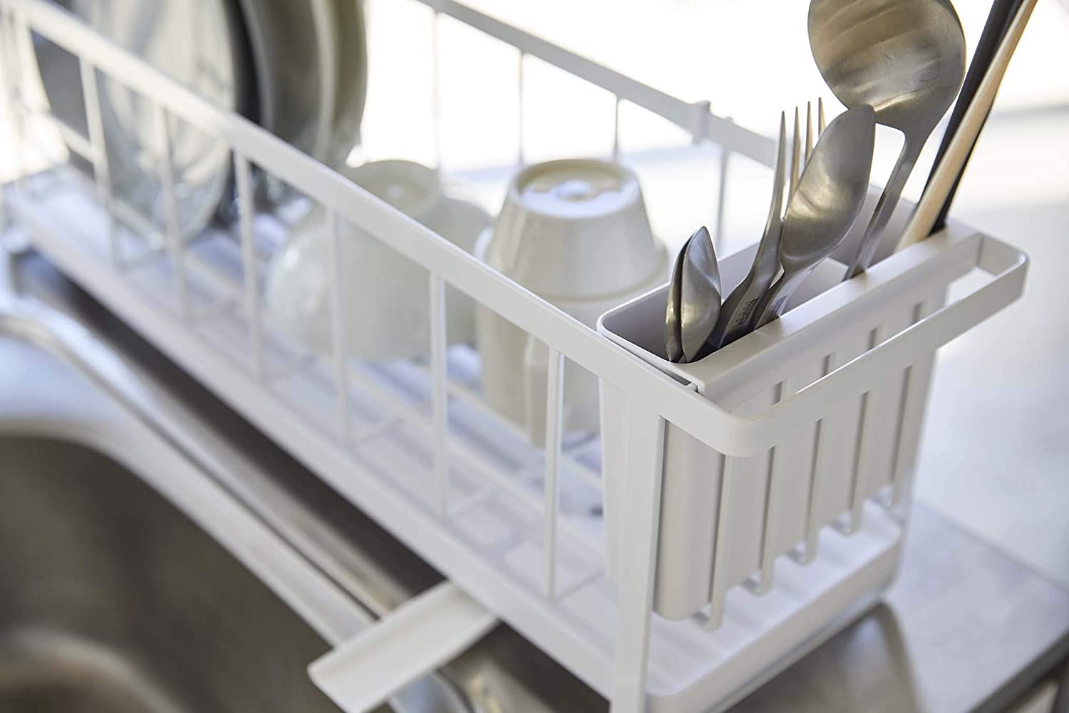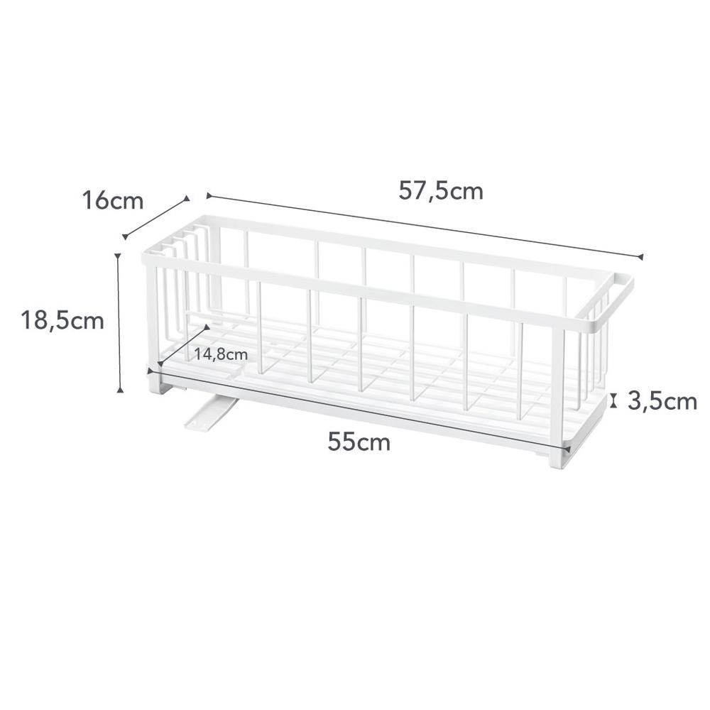 Στεγνωτήριο πιάτων ιδανικό για κουζίνες με περιορισμένο χώρο στο νεροχύτη, λεπτό και πολυμορφικό! Ο δίσκος στη βάση μπορεί να αφαιρεθεί και να χρησιμοποιηθεί ξεχωριστά. Στο πλαϊνό μέρος υπάρχει ράβδος και δύο άγκιστρα όπου μπορούν να κρεμαστούν πετσέτες κουζίνας ή wetex καθώς επίσης και ξεχωριστή θήκη για μαχαιροπήρουνα.
