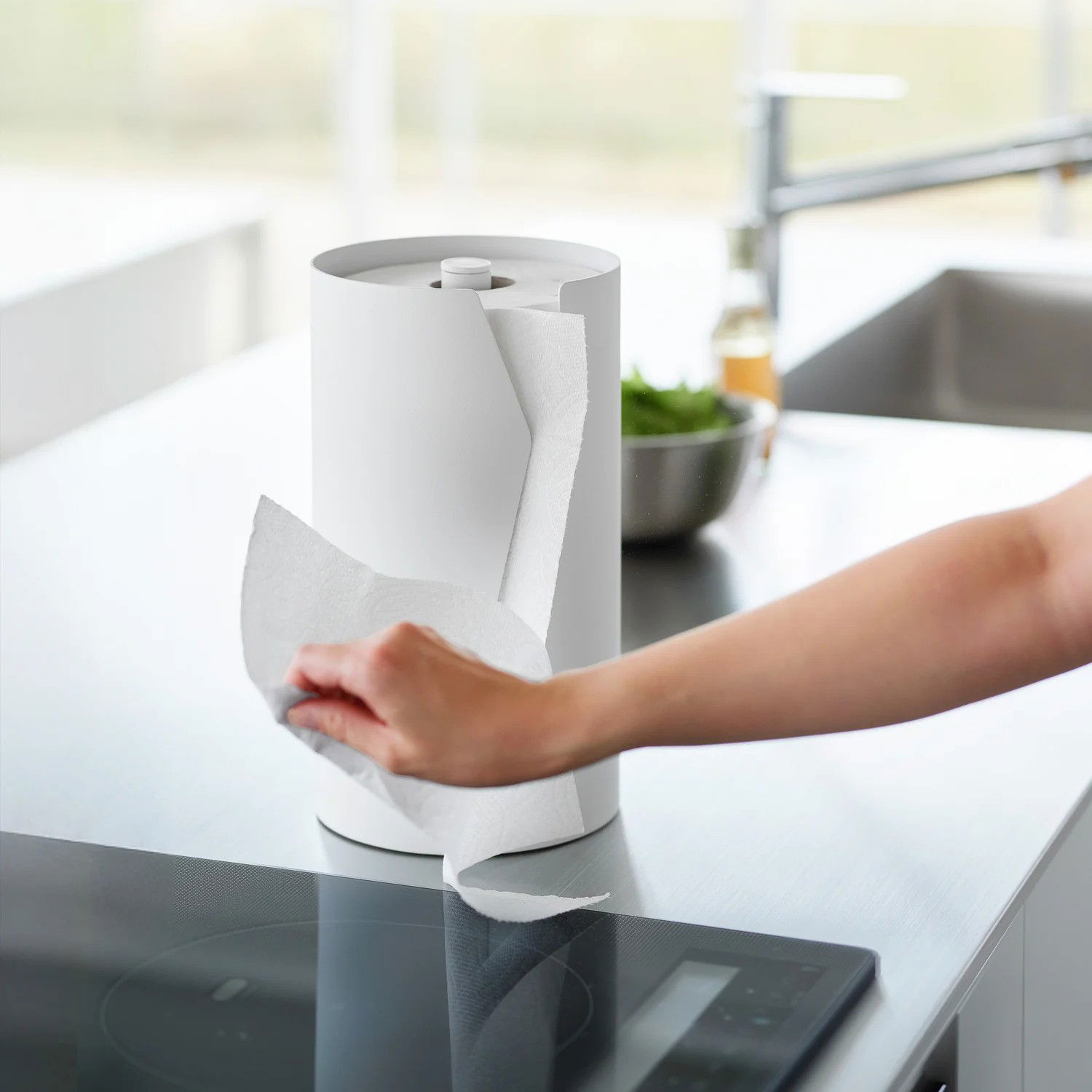 Θήκη για χαρτί κουζίνας με μοναδικό σχεδιασμό που σχεδόν καλύπτει πλήρως το ρολό, διατηρώντας το καθαρό, ενώ η στενή σχισμή επιτρέπει το εύκολο σκίσιμο του διάτρητου χαρτιού με το ένα χέρι.