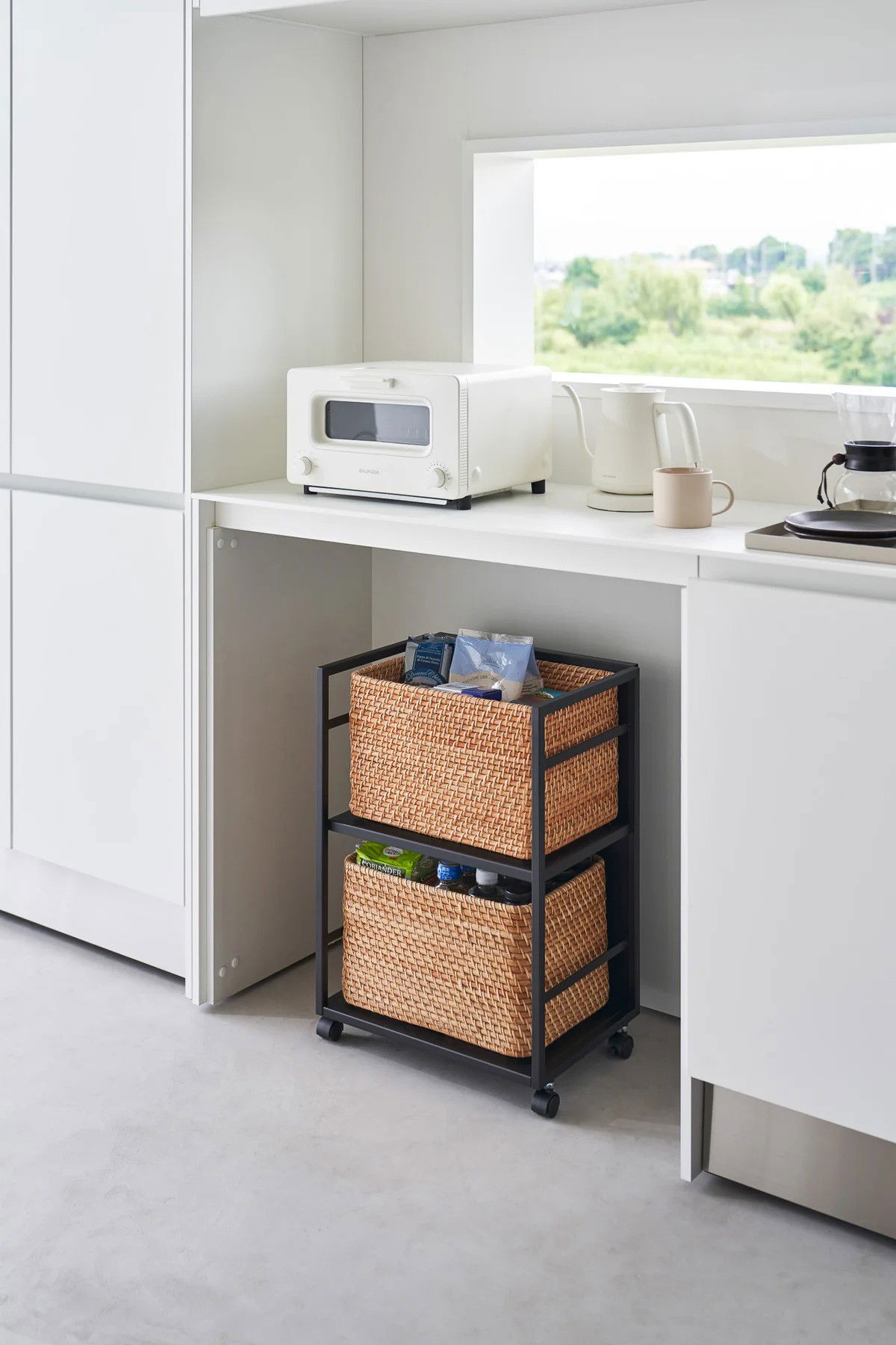 Ένα διακριτικό τρόλει κλειστό από τη μία πλευρά, θα κρατήσει τα είδη οικιακής χρήσης οργανωμένα και επιμελώς κρυμμένα από το οπτικό σας πεδίο.. Οι τροχοί εξασφαλίζουν κινητικότητα και τα δύο ράφια με ρυθμιζόμενο ύψος, προσφέρουν ευέλικτες λύσεις αποθήκευσης.